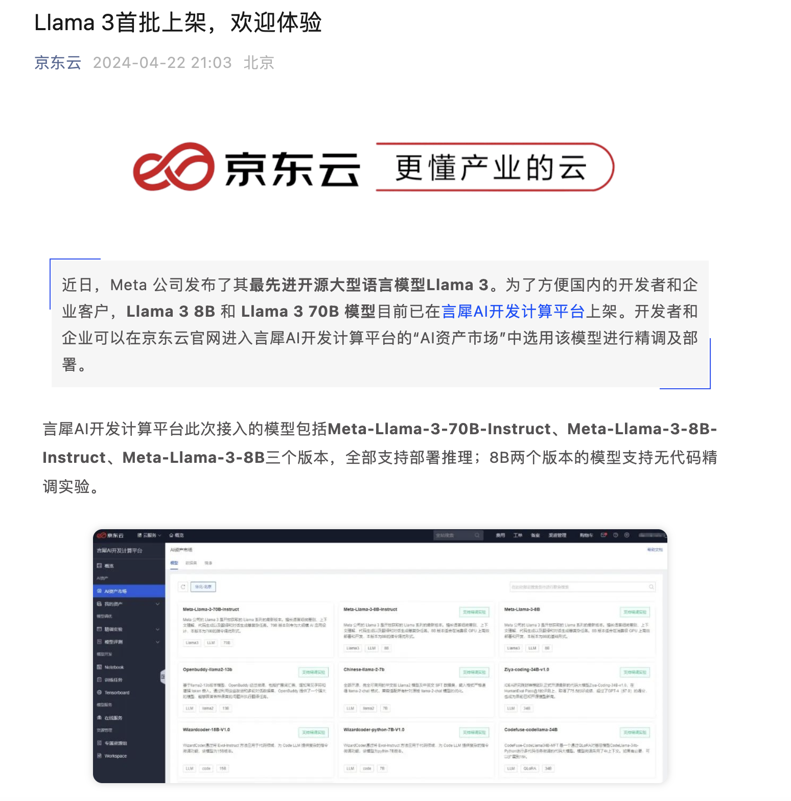 大模型之家讯 今日,京东云官方表示,Llama 3 8B和Llama 3 70B模型已经在言犀AI开发计算平台提供。开发者和企业现在可以在京东云官网的言犀AI开发计算平台的“AI资产市场”中选择这些模型进行精调和部署。